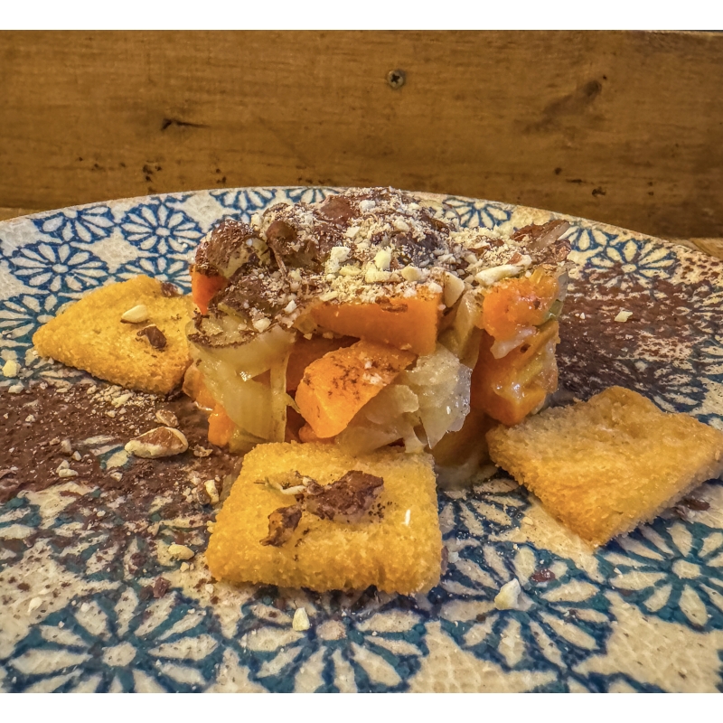 Artisanal Sicilian Traditional Caponata. Made with Red Pumpkin, celery, green olives, extra virgin olive oil, Siciliane golden onion and Aeolian capers. Served with crispy durum wheat bread crostini, almonds, and bitter cocoa.