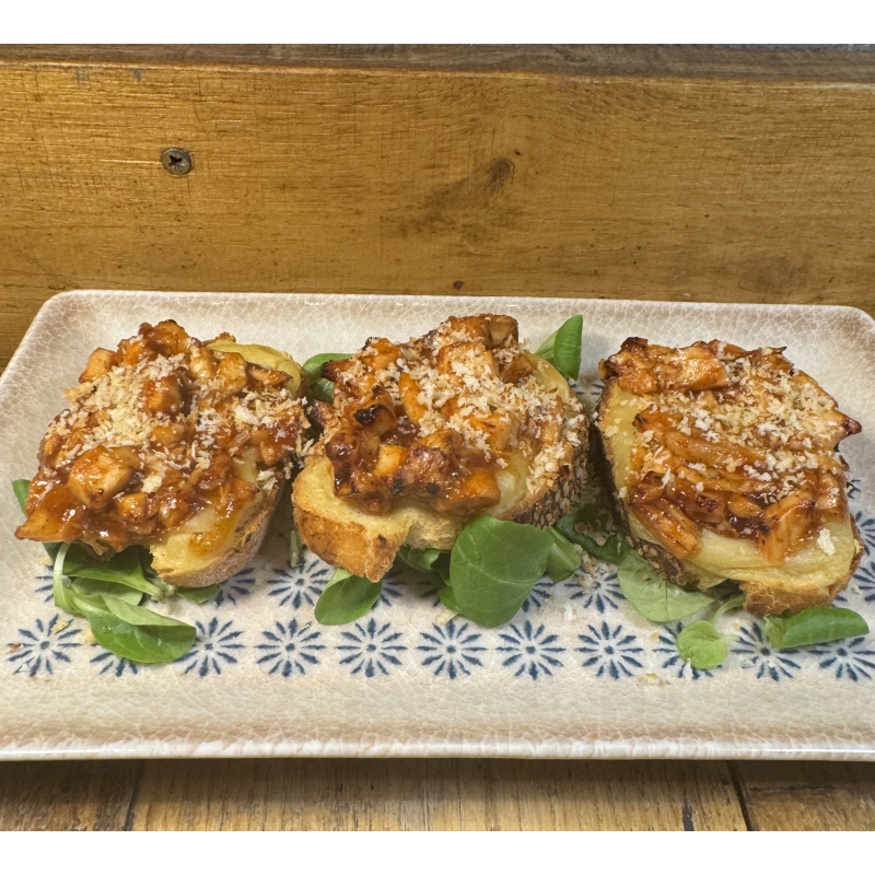 Toasted Monreale Bread Bruschette with the Chef’s Roasted Potato Cream, Homemade Pulled Chicken (Chicken Fillet), Panko Breadcumb and Marsala BBQ Sauce – 3 pcs.