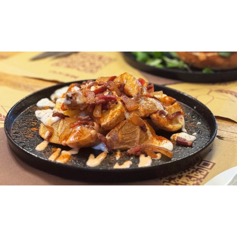 Yellow-fleshed Potatoes with their skins, server Fried with Madonita Provola Fondue, Pink Sauce with Malvasia delle Lipari DOC, Black Pig Cheek and Paprika