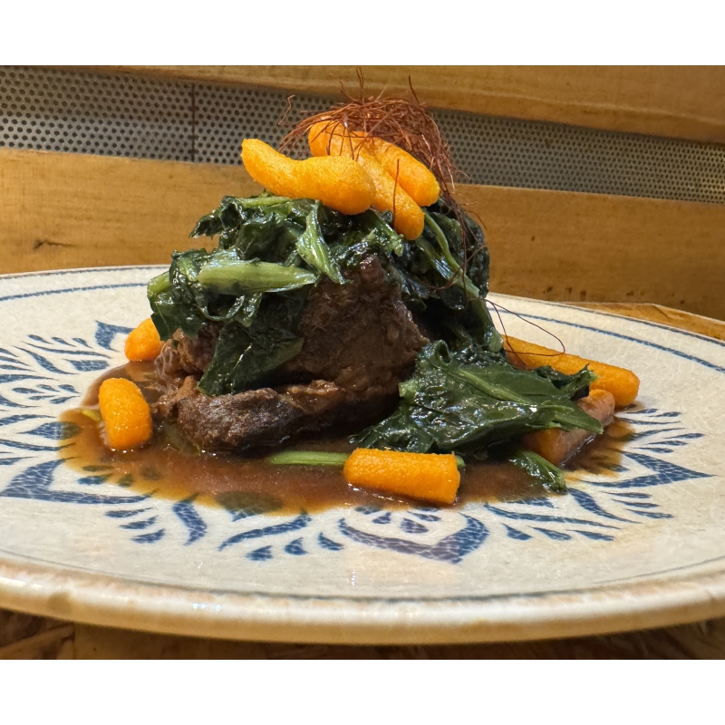 CBT Confit Beef Cheek (Very Slow Low-Temperature Cooking Between 70°C and 90°C). Served with its Reduced Jus, Sautéed Chicory, Baby Carrots and Dehydrated Chili Threads | 230-250 gr. Premium Artisanal Cut