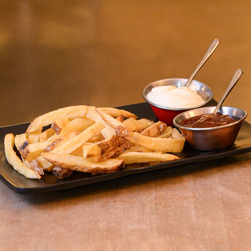 Fried Yellow-Fleshed Potato Sticks with Peel. Served with Mayonnaise and BBQ.