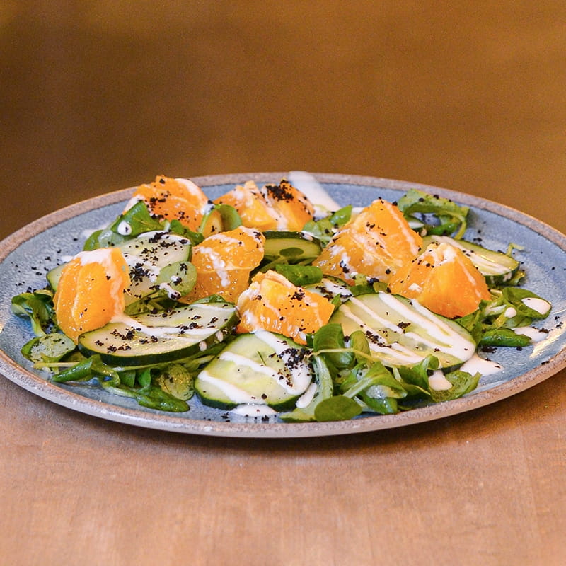 Cucumber, Orange,Red Onion, Yellow Cherry Tomato, Lamb's Lettuce, Cold-Pressed Extra Virgin Olive Oil, Red Chicory, Drops of Yogurt Sauce and Black Olive Ground.