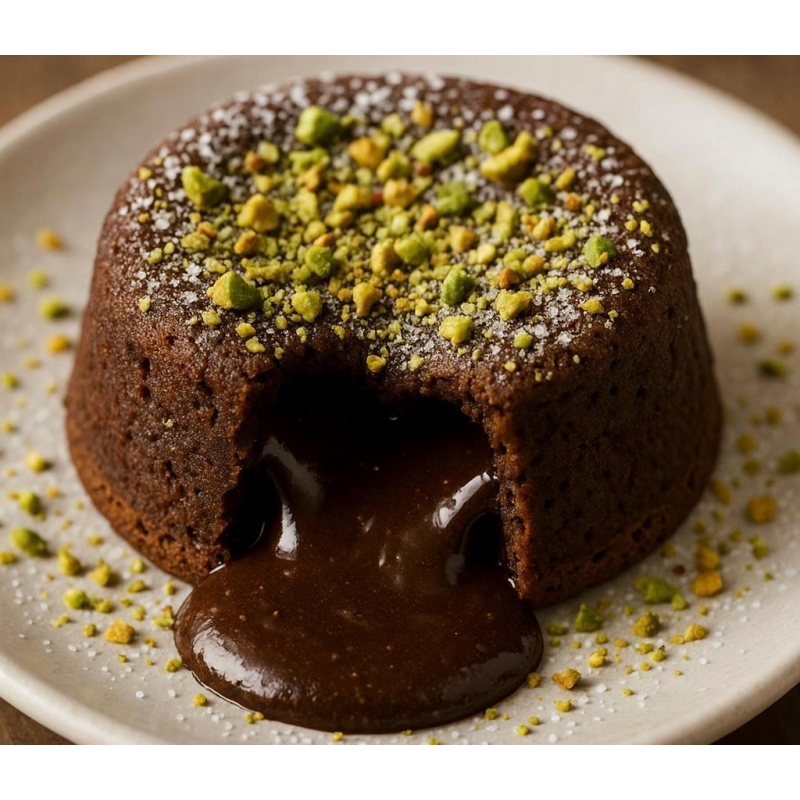 Ingredienti: Soufflé al Cioccolato Fondente servito con Colata di Cacao Amaro dello Chef. Al Piatto con Zucchero a Velo e Granella di Pistacchio