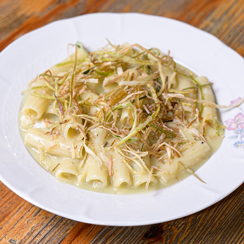 Ingredienti: Rigatoni con crema di patate al rosmarino, provola affumicata e porro croccante