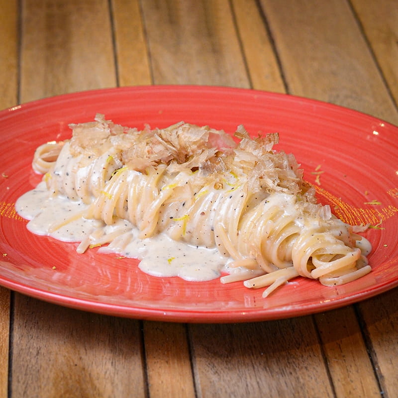 Ingredienti: Spaghetto cacio e pepe con scorza di lime e katsuobushi