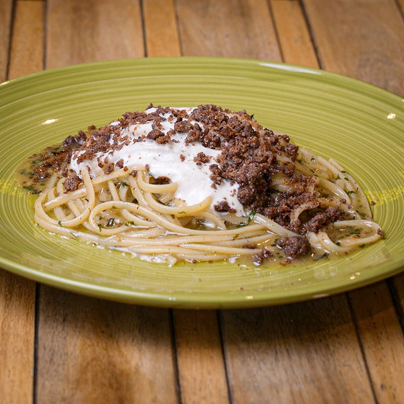 Ingredienti: Spaghetto aglio, olio e peperoncino con terra di olive nere e sifonata di grana padano 16 mesi