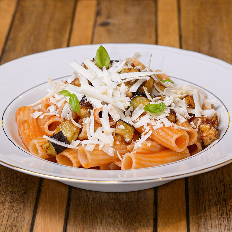 Ingredienti: Mezze maniche con sugo di pomodoro e caviale di melanzane e ricotta salata grattugiata