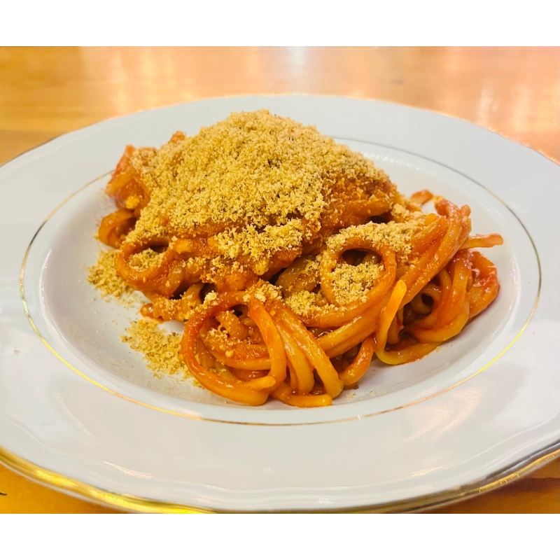 Ingredienti: olive nere tagliate a coltello salsa di pomodoro aglio olio peperoncino servito con mollica tostata