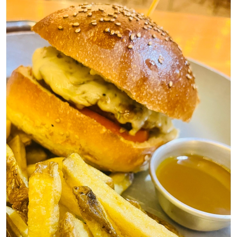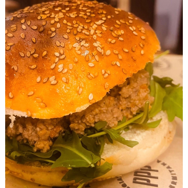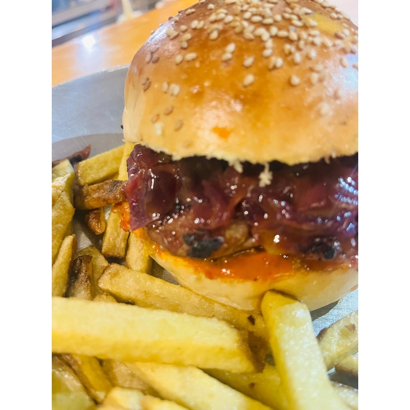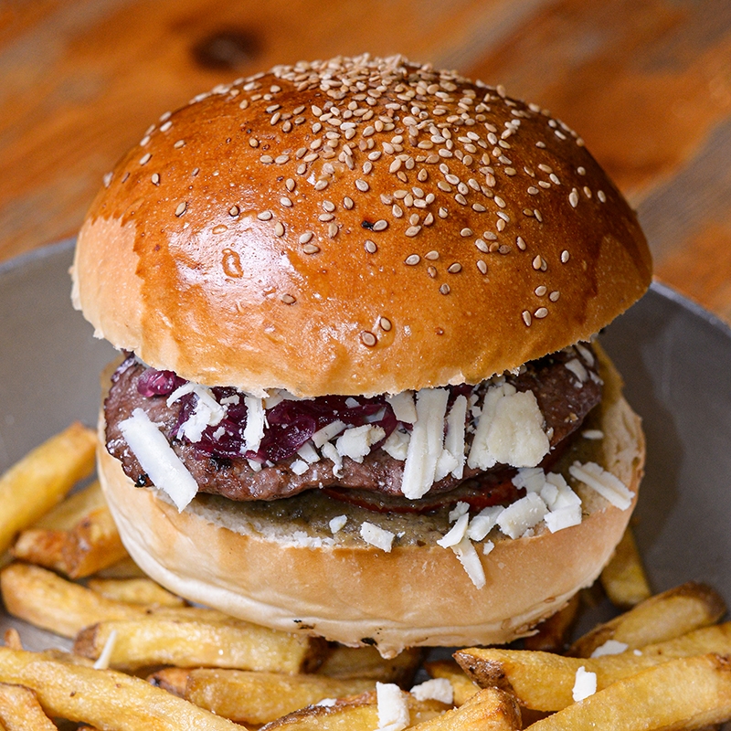 Ingredienti: Burger con 180 gr. vitello di caccamo, iceberg, pomodoro, cheddar e guanciale