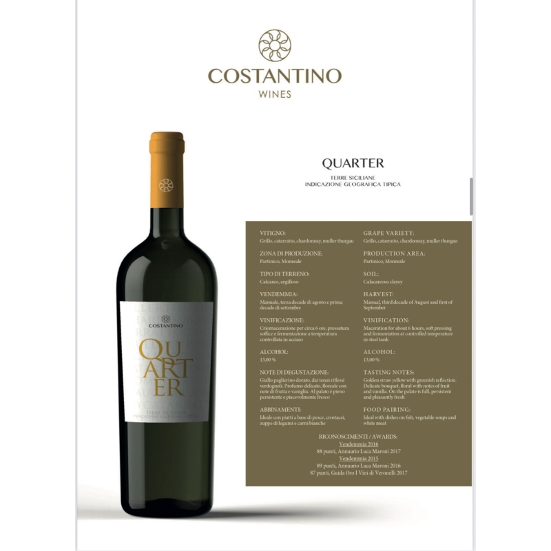 Ingredienti: Costantino / Quarter IGT / Terre Siciliane / Müller Thurgau-Chardonnay-Grillo-Catarratto - MONREALE/PARTINICO
