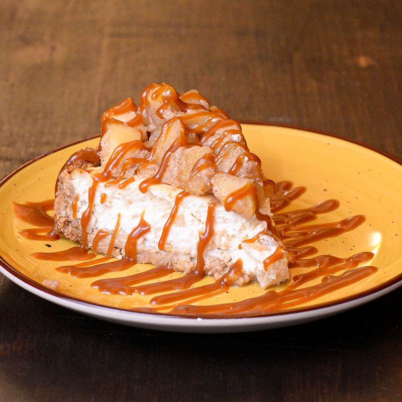 Ingredienti: cheese cake con caramello salato (crema al formaggio, mele, cannella, burro, biscotti, zucchero, panna vegetale, sale)