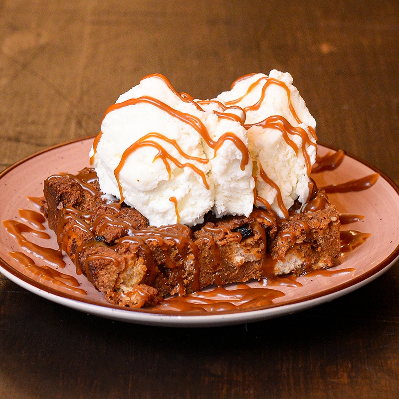 Ingredienti: Pane, caramello, cannella, uva passa, zucchero, uova, baileys, latte, panna.