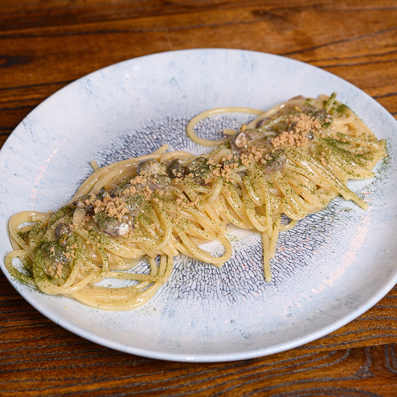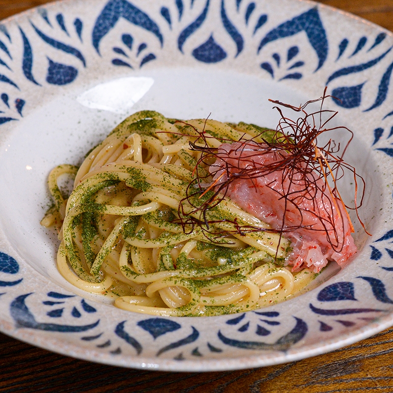 Spaghetti Aglio e Olio con tartare di gambero rosso