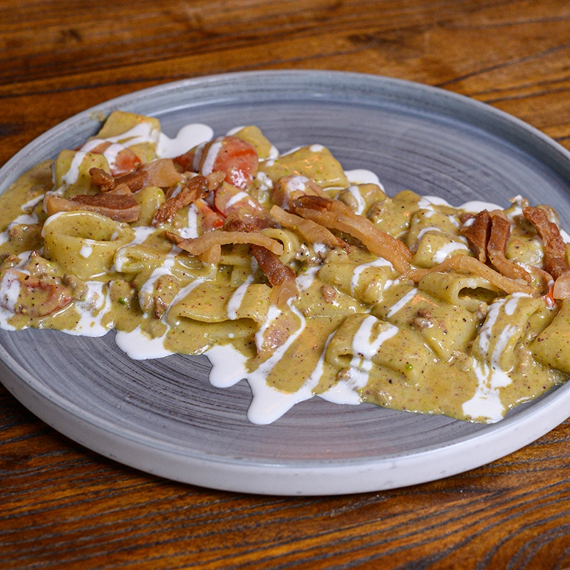 Ingredienti: Paccheri con guanciale, salsiccia, burrata, pesto di pistacchio e pomodorino
