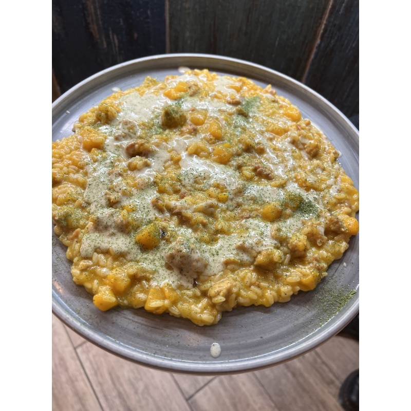 Ingredienti: Risotto mantecato alla zucca con salsiccia e fonduta di gorgonzola