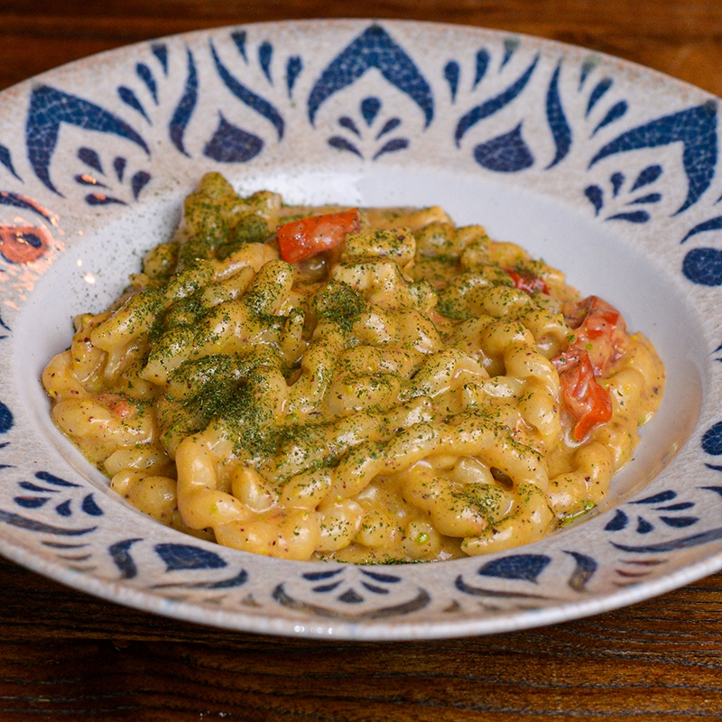Ingredienti: Busiate Pesce Spada, Gamberi, pomodorini, polvere di prezzemolo e pesto di pistacchio