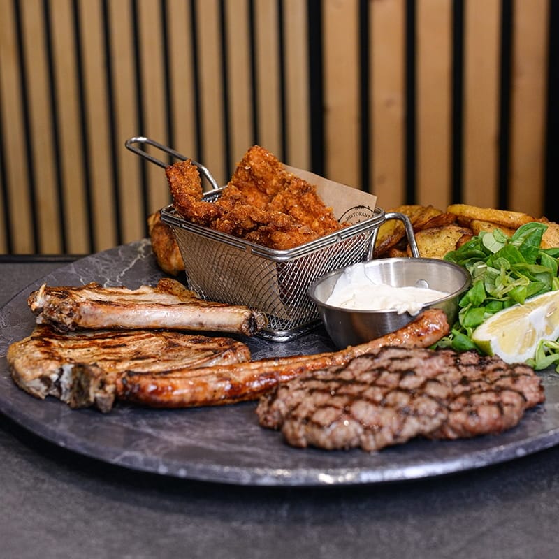 Ingredienti: Hamburger di Vitello, Costata di Maiale, Straccetti di pollo fritto con Panatura Special, Salsiccia, Involtini di Pollo.