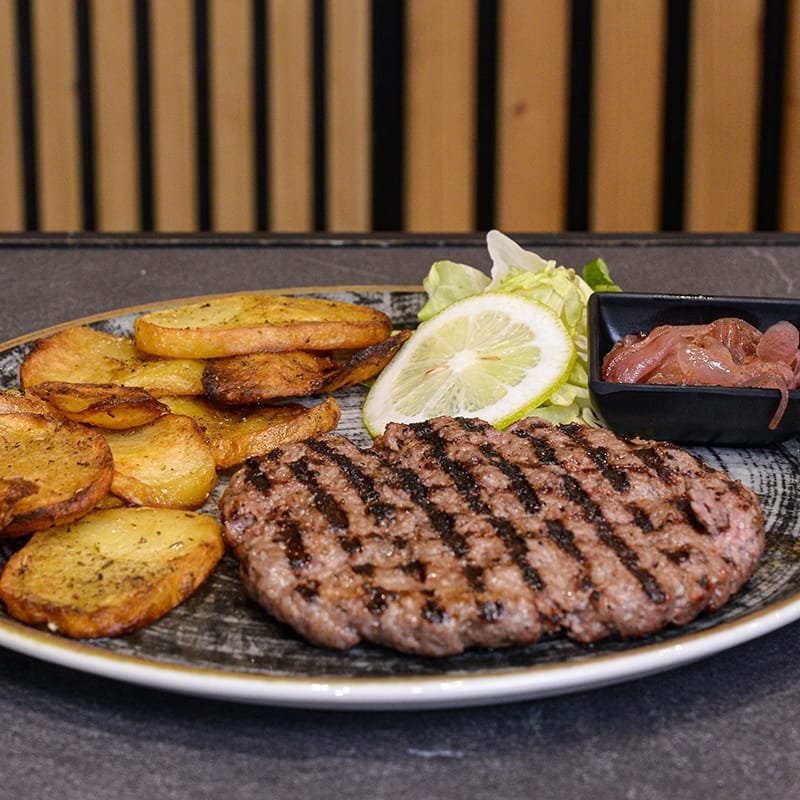 Ingredienti: Hamburger di Vitello 360 gr, Patate al forno, Cipolla caramellata